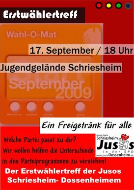 Die Jusos Schriesheim-Dossenheim veranstalten am 17. September ab 18 Uhr auf dem Jugendgelände in Schriesheim einen Erstwählertreff. Weitere Infos dazu gibt es auf unserem Flyer. Zum Anschauen einfach auf den "Mehr"-Button klicken.